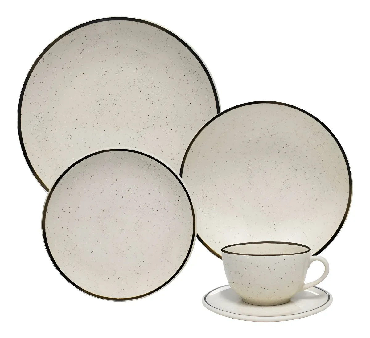 O jogo é composto por 20 peças redondas produzidas em Cerâmica de altíssima qualidade na cor bege claro com bordas e detalhes marrons, proporcionando uma sensação de leveza à sua mesa.